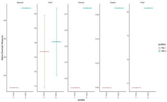 Alpha diversity indices comparing bacterial gut microbiota of P. argentipes (PAG-1) and S. babu (SBG-2). Diversity was assessed using five metrics: Observed, Chao1, Shannon, Simpson, and Fisher. S. babu exhibited higher species richness across all indices, indicating a more diverse microbial community than P. argentipes.