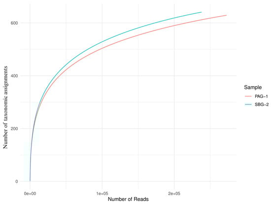 Rarefaction curves of P. argentipes (PAG-1) and S. babu (SBG-2) gut microbiota. The x-axis represents the number of raw reads sampled, while the y-axis shows the number of unique taxonomic assignments observed. The blue curve (SBG-2) reaches a higher plateau than the red curve (PAG-1), demonstrating that SBG-2 harbors greater microbial diversity at equivalent sampling depths.