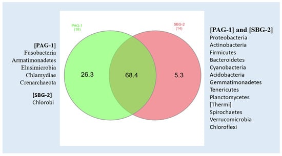 Venn diagram showing bacterial phyla in P. argentipes (PAG-1) and S. babu (SBG-2), highlighting taxa exclusive to each species and those shared between them.