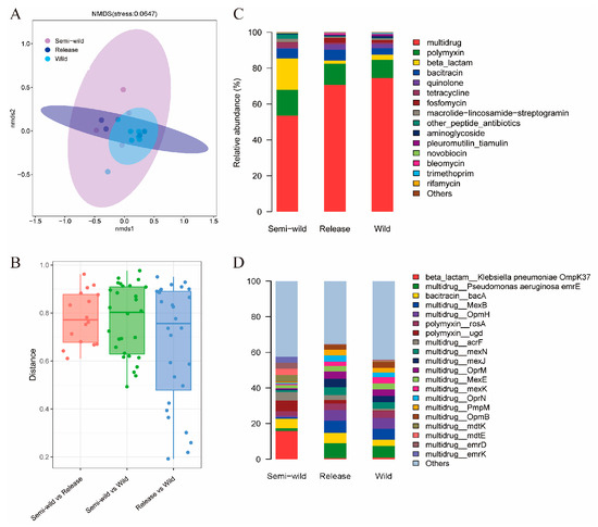 The changes in gut microbial antibiotic resistance genes (ARGs) across giant pandas. (A) Non-metric multidimensional scaling (NMDS) based on Bray–Curtis distance of ARGs showing distinct clustering patterns among semi-wild, released, and wild giant pandas. (B) Boxplot showing Bray–Curtis distances to compare the ARG differences between different stages. (C,D) Relative abundance of dominant ARG types and subtypes in different stages of giant pandas.