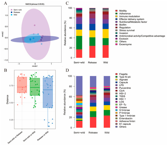 The changes in gut microbial virulence factors (VFs) across giant pandas. (A) Non-metric multidimensional scaling (NMDS) based on Bray–Curtis distance of VFs showing distinct clustering patterns among semi-wild, released, and wild giant pandas. (B) Boxplot showing Bray–Curtis distance to compare the VF differences between different stages. (C,D) Relative abundance of dominant VFs classified by functional categories and names in different stages of giant pandas.