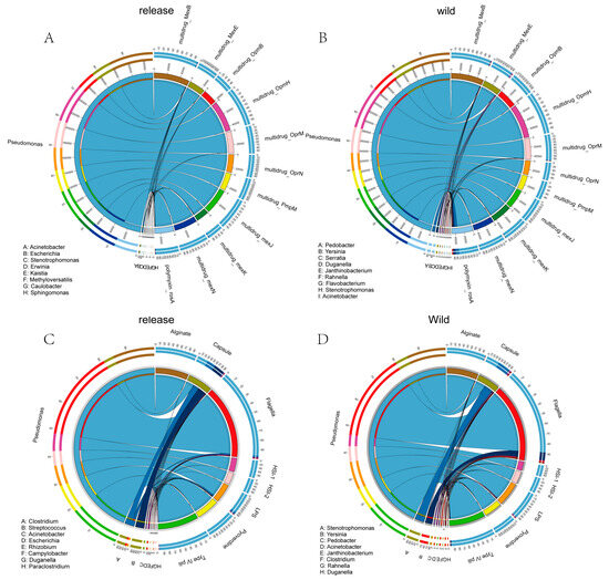 We analyzed the microbial distribution of increased abundance in ARG subtypes and VF names in both released and wild giant pandas compared to semi-wild stages. In both released and wild giant pandas, ARGs were mainly found in Pseudomonas, with minor contributions from other bacterial genera. Similarly, the VFs were also mainly identified in Pseudomonas. Notably, VFs associated with capsule and flagella function exhibited distinct distribution between the two groups. In released giant pandas, the VFs associated with capsule function were primarily found in Pseudomonas, Clostridium, and Streptococcus, whereas in wild giant pandas, Pseudomonas and Stenotrophomonas were the predominant bacterial distribution. For flagella-associated virulence factors, released giant pandas were mainly found in Pseudomonas, while in the wild group, they were additionally identified in Yersinia (Figure 3A–D).