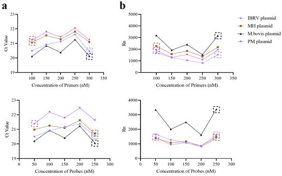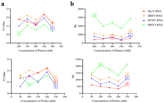 To determine the optimal working concentrations for each primer–probe set, a series of gradient dilutions were tested. Forward and reverse primers targeting the conserved regions of each pathogen were evaluated at final concentrations of 100 nM, 150 nM, 200 nM, 250 nM, and 300 nM. Probes were prepared at working concentrations of 50 nM, 100 nM, 150 nM, 200 nM, and 250 nM. During optimization, all other primer and probe concentrations within the same pool were held constant (200 nmol/L) to avoid interference effects. A plasmid or RNA transcript containing the target fragment was used as a template for amplification under each condition. The performance of each concentration combination was evaluated based on mean Ct values and absolute fluorescence signal intensities (Rn values). For Primer Pool A, mean Ct values are shown in Figure 1a, and the Rn values are presented in Figure 1b. Similarly, results for Primer Pool B are displayed in Figure 2. The optimal concentration was defined as the one yielding the lowest Ct value, indicating the highest amplification efficiency. In cases where multiple concentrations produced similar Ct values, the concentration associated with the highest Rn value—indicating better detection sensitivity—was selected. Based on this systematic evaluation, the final optimized concentrations for all primers and probes were determined and used in subsequent validation experiments (Figure 1 and Figure 2).