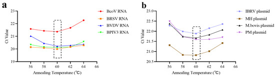 Following the determination of the optimal primer and probe concentrations, reaction conditions were further optimized by evaluating a range of annealing temperatures. Temperatures included 56 °C, 58 °C, 60 °C, 62 °C, and 64 °C were tested. A standard plasmid or RNA transcript containing the target fragment was diluted to a concentration of 105 copies/μL and used as the template. The qPCR assay was performed using both Primer Pool A and Primer Pool B under each temperature condition. The optimal annealing temperature was defined as the one yielding the lowest Ct value, indicating the highest amplification efficiency. The reaction temperature of 60 °C yielded the most favorable amplification performance for both primer pools, as evidenced by significantly lower Ct values across all target pathogens, demonstrating that an annealing temperature of 60 °C is optimal for the developed multiplex qPCR assay (Figure 3).