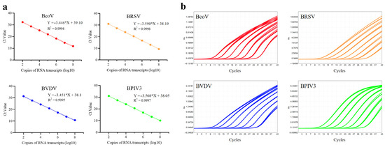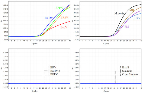 The specificity of the developed multiplex qPCR assay was evaluated using standard plasmids or RNA transcripts containing target gene sequences. In addition, the assay was tested against nucleic acids from non-target bovine pathogens stored in our laboratory, including bovine rotavirus (BRV), bovine epizootic fever virus (BEFV), bovine herpesvirus 4 (BoHV-4), Escherichia coli (E. coli), Staphylococcus aureus (S. aureus), and Clostridium perfringens (C. perfringens). The amplification curves demonstrated that the established method exhibits high specificity to the target nucleic acids, with no cross-reaction to non-target pathogens or host DNA extracted from bovine blood samples (Figure 6).