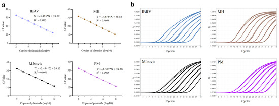 Standard curves were constructed under optimized reaction conditions to assess the amplification efficiency and linearity of the multiplex qPCR assay. Serial 10-fold dilutions of plasmid DNA or transcribed RNA containing target sequences were prepared, ranging from 108 to 102 copies/µL. Following the qPCR run, standard curves were constructed by plotting the Ct values obtained from qPCR amplification on the y-axis against the logarithm of the template copy numbers on the x-axis. The standard curves for Primer Pool A are shown in Figure 4, and those for Primer Pool B are shown in Figure 5. The slopes of the standard curves for the targets in Primer Pool A of BVDV, BPIV3, BRSV, and BcoV RNA transcripts were −3.451 (amplification efficiency: 94.88%), −3.508 (92.78%), −3.590 (89.91%), and −3.446 (95.07%), respectively. The slopes of the standard curves for the targets in Primer Pool B of M.bovis, PM, MH, and IBRV plasmids were −3.434 (95.53%), −3.507 (92.82%), −3.558 (91.01%), and −3.433 (95.56%), respectively. The R2 values for all targets in Primer Pool A and Primer Pool B exceeded 0.999, demonstrating excellent linearity and efficient amplification. These results confirm that both primer pools exhibit excellent amplification performance, with high sensitivity and reproducibility over a wide dynamic range.