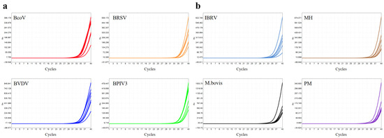 To optimize amplification efficiency and minimize cross-reactivity among targets, the eight primer–probe sets were divided into two separate reaction panels. Four primer–probe sets targeting BVDV, BPIV3, BRSV, and BcoV were combined into Primer Pool A, while the remaining four sets targeting M.bovis, PM, MH, and IBRV were grouped into Primer Pool B.