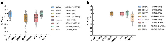Results of clinical sample testing. (a) Detection results of eight pathogens and associated Ct value distributions in Farm A (n = 504). (b) Detection results of eight pathogens and associated Ct value distributions in Farm B (n = 508). Each dot in the figure represents a positive sample, with its position on the y-axis indicating the corresponding Ct value.