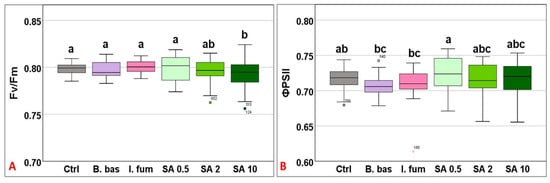 Box plot chart comparing maximum quantum efficiency (Fv/Fm) (A) and the effective quantum efficiency of PSII (ΦPSII) (B) among control plants (Ctrl) and plants treated with B. bassiana (B. bas) and I. fumosorosea (I. fum), as well as salicylic acid at 0.5 mM (SA 0.5), 2 mM (SA 2), and 10 mM (SA 10) solutions. Error bars represent mean ± standard deviation. Different lowercase letters denote statistically significant differences between treatments (p < 0.05).