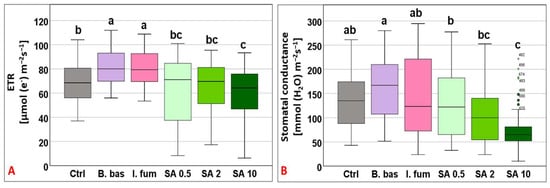 Box plot chart comparing electron transport rate (ETR) (A) and stomatal conductance (gs) (B) among control plants (Ctrl) and plants treated with B. bassiana (B. bas) and I. fumosorosea (I. fum), as well as salicylic acid at 0.5 mM (SA 0.5), 2 mM (SA 2), and 10 mM (SA 10) solutions. Error bars represent mean ± standard deviation. Different lowercase letters denote statistically significant differences between treatments (p < 0.05).