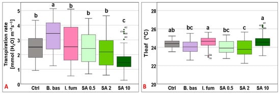 Box plot chart comparing transpiration rate (E) (A) and leaf temperature (Tleaf) (B) among control plants (Ctrl) and plants treated with B. bassiana (B. bas) and I. fumosorosea (I. fum), as well as salicylic acid at 0.5 mM (SA 0.5), 2 mM (SA 2), and 10 mM (SA 10) solutions. Error bars represent mean ± standard deviation. Different lowercase letters denote statistically significant differences between treatments (p < 0.05).