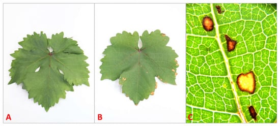 Leaves of Sauvignon Blanc: control (A), treated with 10 mM of salicylic acid (B), and necrotic spots caused by 10 mM of SA under stereomicroscope (SZX16 plus EP 50 digital camera, Olympus, Tokyo, Japan) at 14× magnification (C).