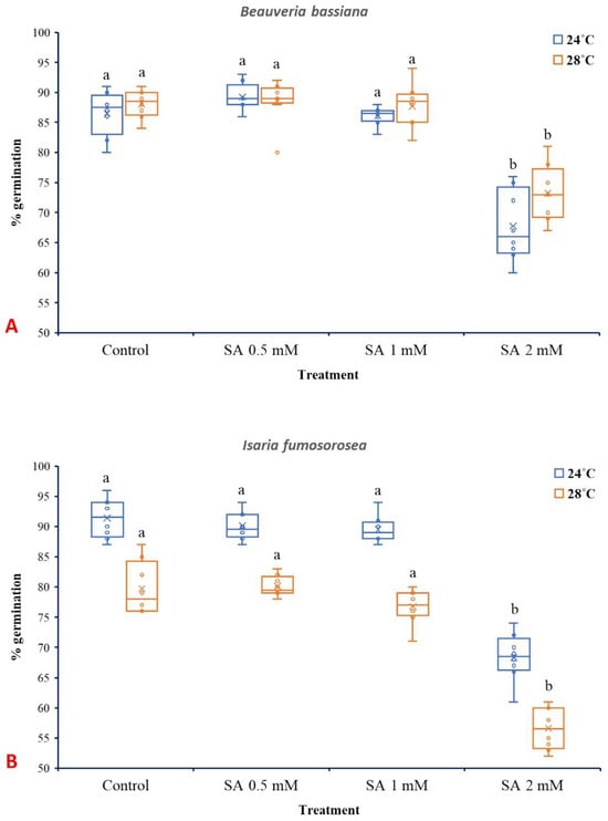 Box plots presenting the median values with upper and lower quartiles. The whiskers represent the range of the variabilities outside the quartiles, and the outliers are plotted as individual points. The × represents the mean percentage of spore germination of B. bassiana IMI-391044 (A) and I. fumosorosea EBAC-01 (B) in half-strength SDA agar (control), fortified with 0.5, 1, and 2 mM of SA, after 18 h of incubation at 24 °C or 28 °C. Different letters indicate significant differences (p < 0.05) for each temperature.