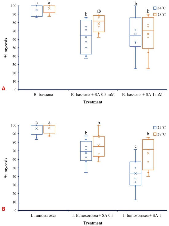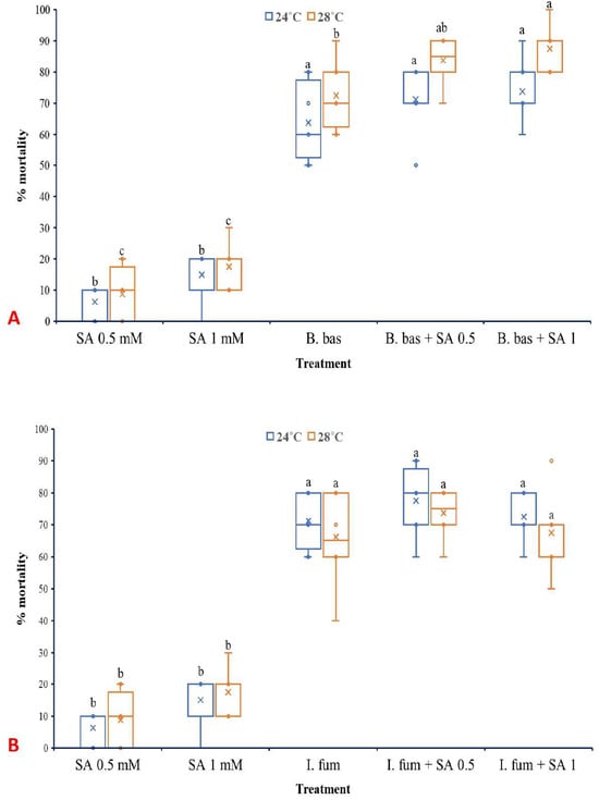 Box plots presenting the median values with upper and lower quartiles. The whiskers represent the range of the variabilities outside the quartiles, and the outliers are plotted as individual points. The × represents the mean percentage of L. botrana larval mortality caused by B. bassiana IMI-391044 (A) and I. fumosorosea EBAC-01 (B), in single or combination treatments with SA, seven days post-treatment. Different letters indicate significant differences (p < 0.05) for each temperature.