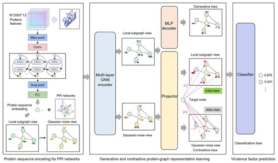Most relevant studies primarily focus on the properties of proteins, including sequences, physicochemical properties, evolutionary information, and structural characteristics, to identify VFs. However, protein–protein interaction (PPI) network information has also been demonstrated to have potential in VF prediction. Reference [] proposes a method to predict VFs based on the PPI network through the number, type, and interaction weight of neighbor nodes. Reference [] further enriches the direct interaction neighbors of proteins into KEGG pathways, calculates the pathway enrichment scores, and uses the random forest model for prediction. However, these methods only utilize direct protein interactions and explicit features, such as the number and labels of neighbors, as well as pathway enrichment scores, which are limited to shallow information within the direct neighborhood. They lack comprehensive modeling of broader contextual and deeper information on PPI networks and do not fully leverage the biological features of proteins themselves, such as sequence and structure. Moreover, explicit features rely on known protein functional annotations, and the models may be restricted by incomplete annotation information, making it difficult to comprehensively capture the implicit properties of unannotated proteins. Since the PPI network can be naturally modeled and mined using a graph structure, GNNs can be taken into account to address the above limitations.
