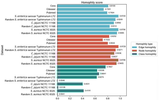 We have employed three commonly used homophily metrics—edge homophily [,], node homophily [], and class homophily []—to evaluate the homophily of three PPI networks: Salmonella enterica serovar Typhimurium LT2, Campylobacter jejuni NCTC, and Staphylococcus aureus NCTC 8325. In addition to comparing with three homophily graphs commonly used in node classification tasks, we also compared the homophily of PPI networks with the randomly generated networks. We ensured that the randomly generated networks are of the same size as the corresponding PPI networks, in order to eliminate the influence of network size differences and focus precisely on the homophily aspect during the comparison process. For each PPI network, 30 random graphs were generated with the same number of nodes and edges, as well as identical label distributions. We employed the Configuration Model to preserve the degree distribution while randomizing edge connections. The Configuration Model algorithm represents each node’s degree as a corresponding number of “stubs” (half-edges), then randomly pairs all stubs to form complete edges while avoiding self-loops and multi-edges. This randomization process maintains both the class proportions and the original degree distribution, allowing us to isolate the effect of class-based connectivity patterns on homophily while controlling for degree heterogeneity. The three homophily metrics were calculated and subjected to t-tests (p-values all less than 0.05). The results are shown in Figure 2.