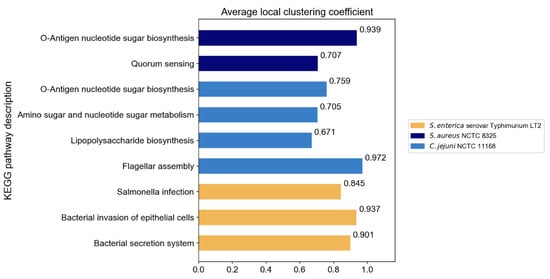 The average local clustering coefficient of virulence proteins in KEGG pathways.
