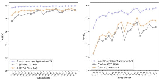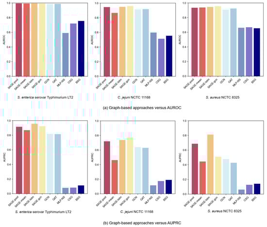 Figure 4a,b present comparative AUROC and AUPRC metrics across the three bacterial strain datasets. In the experiments’ PPI of the graph-based GNN variant, GraphSAGE models consistently outperformed GCN and GAT, with superior performance from LSTM and Pooling aggregators. The LSTM aggregator achieved optimal performance, primarily due to its distinctive sequence processing mechanism. By establishing continuous dependency chains between nodes, it effectively captured complex neighbor relationships, which might have enhanced the GNNs’ expressive capacity in neighbor feature aggregation, enabling more comprehensive node-dependency modeling. Meanwhile, the Pooling aggregator, by adaptively identifying key features from neighbors, focused attention on important information for VF prediction.