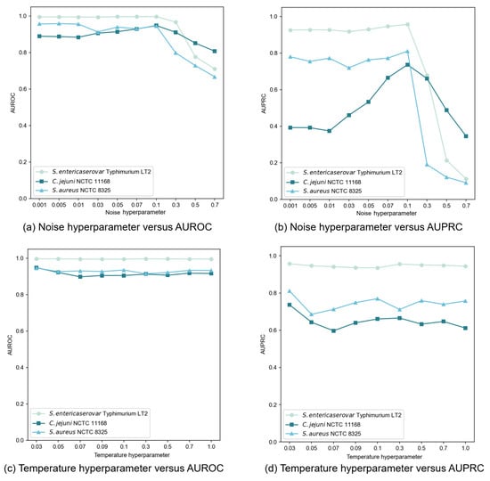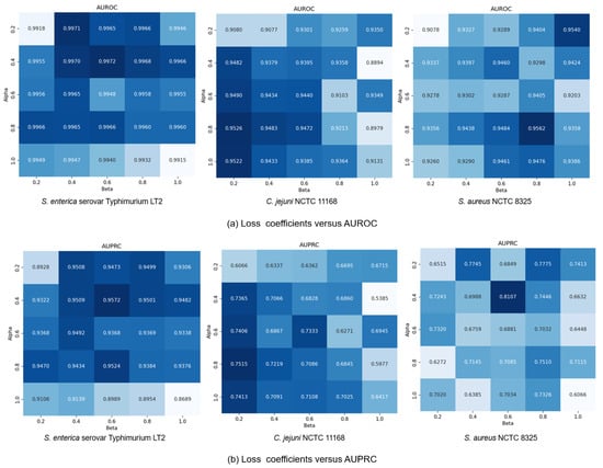 Finally, we explored how the coefficients and in loss function (13) affected model performance by modulating the influence of generative and contrastive self-supervised modules. Given that self-supervised learning serves an auxiliary role to classification, we constrained both and to (0, 1]. We set the coefficients in a range of {0.2, 0.4, 0.6, 0.8, 1.0} and conducted a comprehensive exploration of different combinations within this range. Results in Figure 7 show that small coefficients ( = 0.2, = 0.2) led to suboptimal performance due to insufficient feature learning, while large values ( = 1.0, = 1.0) compromised classification capability by overemphasizing self-supervised tasks. The C. jejuni NCTC 11168 dataset showed particular sensitivity to the generative loss coefficient , performing best with high and low values ( = 0.2). Conversely, the S. enterica serovar Typhimurium LT2 dataset exhibited performance degradation at = 1.0, suggesting dataset-specific dependencies on different self-supervised learning modules. Based on these findings, we standardized at 0.4 while allowing to vary by dataset: = 0.2 for S. aureus NCTC 8325 and = 0.6 for the other datasets, achieving optimal cross-dataset performance.