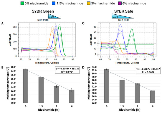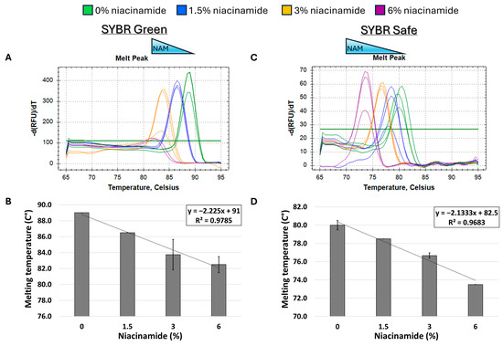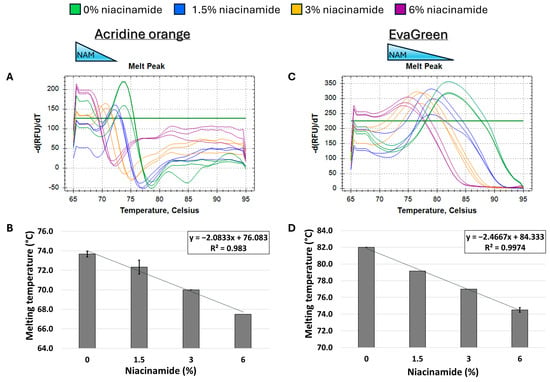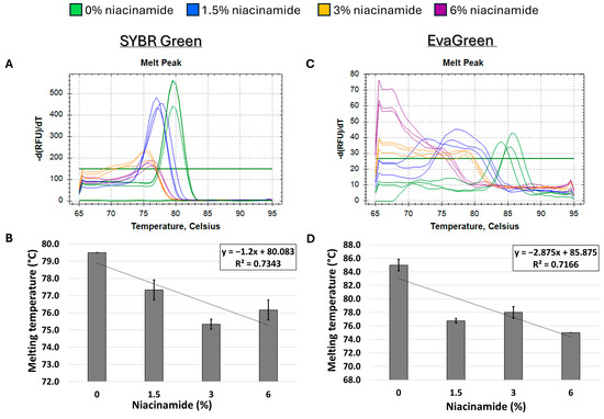 All melting curve analysis experiments were performed using a 0.5 °C temperature increment, starting from 65 °C up to 95 °C, with a 5 sec hold time in-between steps. Briefly, the DNA concentration used was 2.3 ng/µL in Tris-EDTA (TE) pH = 7.4 buffer (Thermo Fisher Scientific, Lod, Israel). Each reaction was supplemented with either mono- or bis-intercalating fluorescent dyes to a final concentration of 1X units of SYBR Safe, 9.5 µM acridine orange, and 1X EvaGreen. Then, each reaction was supplemented with various concentrations of niacinamide diluted in TE buffer to final concentrations of 0–6%. For SYBR Green (509.73 g·mol−1) melting curve analysis, niacinamide was added directly to the PCR mixture, post-amplification.