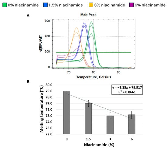 Niacinamide’s interaction with a low-GC bacterial fragment is not linear. Melting curve analysis of S. aureus 231 bp femB fragment (31% GC) with SYBR Green. Melting peaks of a representative experiment (A) and Tm regression plot (B) are presented. Standard deviation is based on triplicate wells, with each experiment performed three times.