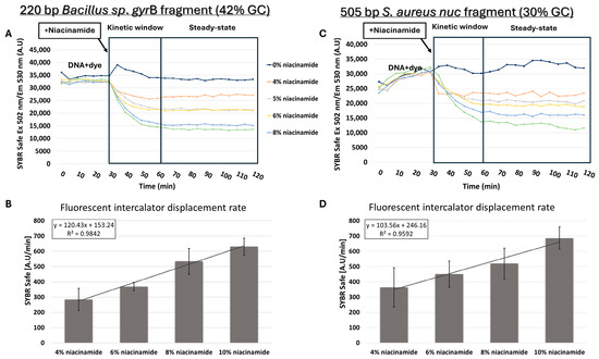 Based on melting curve analysis, “destabilizing intercalation” and dye dislocation by niacinamide was suggested as a feasible mode of interaction with bacterial DNA. Direct competition with a known intercalator was previously used to further support intercalation as the mode of binding of small ligands to DNA [16]. For that purpose, competition assays were performed between niacinamide and dsDNA bound to the fluorescent intercalator SYBR Safe. Prior to the addition of niacinamide, DNA was incubated for 30 min with a predetermined concentration of the fluorescent intercalator, which was first verified not to have non-specific background fluorescent signal (Supplementary Figure S2). FID assay using 220 bp Bacillus sp. gyrB fragment (42% GC) clearly demonstrated a dose-dependent decrease in fluorescent signal following the addition of niacinamide, indicating that niacinamide can displace the bound fluorescent intercalator from the DNA (Figure 7A). Furthermore, the average intercalator displacement rate increased linearly with niacinamide concentration (Figure 7B). Surprisingly, similar results, including the linearity of the displacement rate increase, were also obtained for 505 bp S. aureus nuc fragment with a low GC content of 30% (Figure 7C,D).