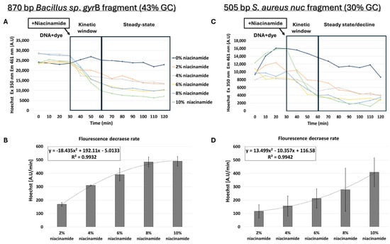 Competition assays were also performed using a 505 bp S. aureus nuc fragment (30% GC) (Figure 8C,D). Although Hoechst fluorescence decreased with higher niacinamide concentration in a polynomial manner, the regression curve of this low-GC fragment was different from the Bacillus sp. fragment with 43% GC (Figure 8B). In the 43% GC fragment, the fluorescence decrease was higher in comparison to the 30% fragment and reached a plateau at 8% niacinamide; in addition, the standard deviations were lower in the 43% GC fragment, suggesting once again a preferable binding of niacinamide to GC over AT.