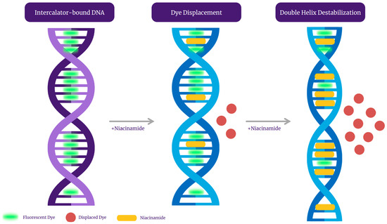 Qualitative analysis of the melting peaks of bacterial dsDNA fragments in the presence of niacinamide also demonstrated a dose-dependent decrease in the height of the melt peak in the presence on niacinamide, which is consistent with partial denaturation of the dsDNA fragments by niacinamide, as well as dislocation of the fluorescent intercalating dye. Taken together, these observations, combined with the putative intercalative properties of niacinamide, has led us to propose “disruptive intercalation” and dye displacement as the mode of interaction for niacinamide with bacterial dsDNA (Figure 9). Such a putative mode of interaction is in agreement with previously published data, demonstrating that niacinamide binding to Bacillus sp. gyrB fragment resulted in band migration as well as a decrease in band intensity at a niacinamide concentration equal or superior to 30% [1]. Equally, Maikoo et al. previously concluded, based on a dose-dependent reduction in intensity of ethidium bromide (EtBr)-stained DNA, that a few ruthenium compounds were able to displace the DNA intercalator, EtBr [16].