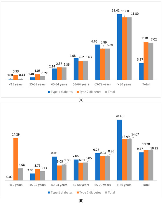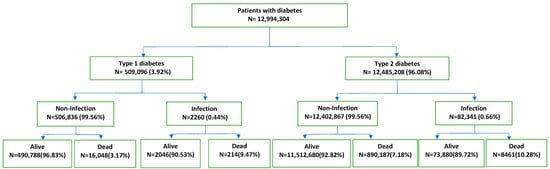 Of these patients included in the study, 509,096 (3.92%) had type 1 D and 12,485,208 (96.08%) had type 2 D (Figure 1). Of the patients with type 1 D, 260,321 were male, or 51.13% (mean age ± standard deviation, 44.78 ± 22.53 years), and 248,775 were female, or 48.57% (mean age ± standard deviation, 45.52 ± 24.59 years). According to the common age distribution of D1 in pediatric age, 66,237 (13.01%) children were aged <15 years. Of the patients with type 2 D, 6,916,624 were male, or 55.40% (mean age ± standard deviation, 71.19 ± 11.52 years), and 5,568,584 were female, or 44.60% (mean age ± standard deviation, 75.21 ± 11.85 years).