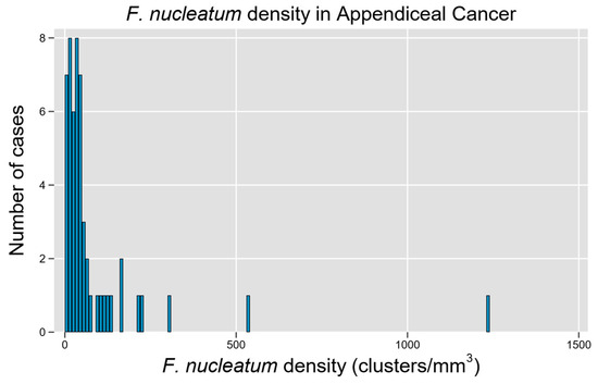 F. nucleatum is prevalent and widely variable in tissue tumor content among cases of appendiceal cancer. Histogram of Fn density among examined cases demonstrates a right-skewed distribution with high-Fn-density outliers.