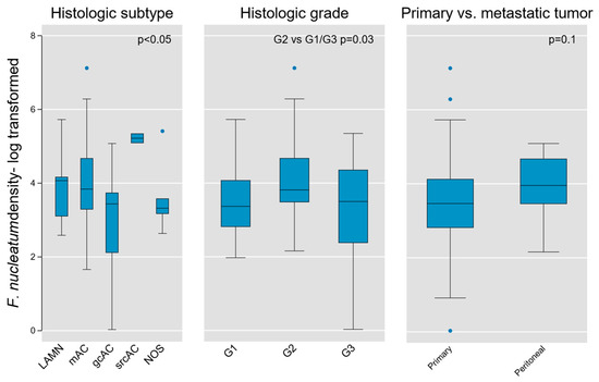 Association of intra-tumoral Fn density with tumor histologic type, grade, and location (primary vs. peritoneal metastases) in AC. Weak evidence for variation on the basis of histologic type and grade was found (p value shown for Kruskal–Wallis equality of populations rank test), whereas no measurable difference was obtained between primary and metastatic lesions. LAMN, low grade appendiceal mucinous neoplasm; mAC, mucinous adenocarcinoma; gcAC, goblet cell adenocarcinoma; srcAC, signet ring cell adenocarcinoma; AC NOS, adenocarcinoma not otherwise specified; G1, Grade 1; G2, Grade 2; G3, Grade 3.