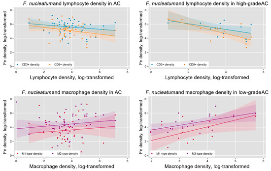 Our findings suggest a unique relationship between the tumor immune microenvironment and Fn in AC. Prior studies in CRC have demonstrated that Fn can suppress immune responses, enabling immune escape and tumor progression [42]. We found an overall negative association between lymphocyte and Fn densities, which is in parallel with previously reported studies in CRC highlighting lymphocyte apoptosis activation by Fn-derived Fap2 and RadD [43]. We also noted an overall positive association between TAM and Fn density in AC. Moreover, we found preliminary evidence that these associations are histologic grade-dependent, although further corroboration in larger datasets will be necessary. We have previously reported that intra-tumoral lymphocyte density is associated with improved survival in AC [44,45], whereas the M2-like macrophage density is associated with higher disease volume and progression risk in AC [46]. These apparent prognostic implications of the immune microenvironment in AC make any association with microbiome influences noteworthy and deserving of additional investigation.
