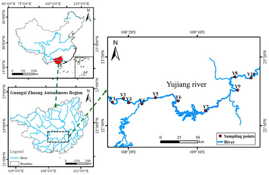 The Yujiang River is the largest tributary of the Xijiang River, which is part of the Pearl River system in southern China. As a typical riverine ecosystem in this region, the Yujiang River is subject to both natural and anthropogenic influences. These characteristics make the Yujiang River a representative model for investigating microbial ecology in subtropical freshwater ecosystems. Water samples were collected from 10 sites along the Yujiang River in October 2023 (Figure 1). At each station, approximately 2 L of water was collected. Firstly, 1 L of water was immediately filtered through 0.22-micrometer polycarbonate membranes. The filter membranes were subjected to quick-freezing in liquid nitrogen, following which they were stored at −80 °C until DNA extraction. A further 1000 mL of water samples was stored temporarily at 4 °C for the purpose of conducting a series of environmental variable analyses.