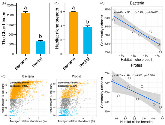 Comparisons of alpha diversity (a) and habitat niche breadth (b) between bacterial and protistan communities. (c) Distribution of specialists and generalists in bacterial versus protistan communities. (d) Linear regression of habitat niche breadth with their alpha diversity. The blue line in each sub-figure represents the fitted curve, and the gray shadow represents the 95% confidence interval. Different lowercase letters indicate significant differences between groups (p < 0.05).
