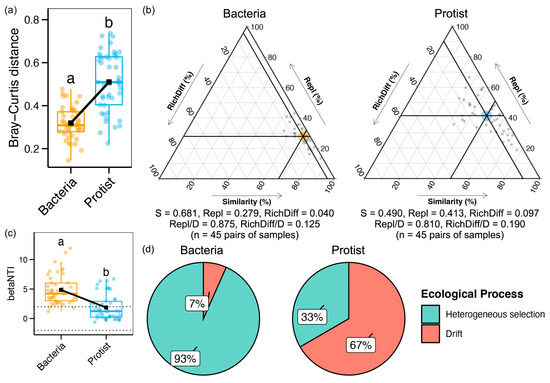 (a) Difference in the beta diversity between bacterial and protistan communities (Wilcoxon test, p < 0.05). (b) Comparison of species replacement and richness difference between bacterial and protistan communities. (c) Difference in the betaNTI between bacterial and protist communities. (d) Ecological processes in shaping the assembly of bacteria and protists. Different lowercase letters indicate significant differences between groups (p < 0.05).