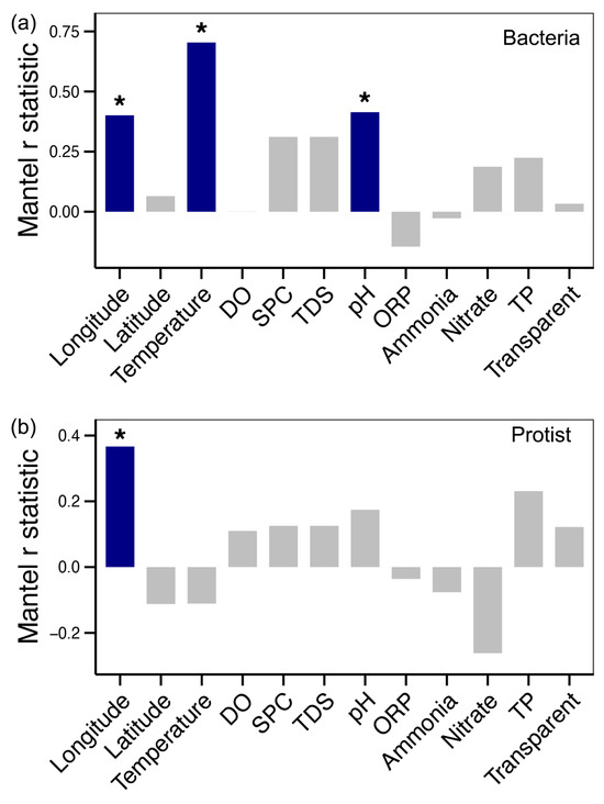 RDA showed that bacterial community variation was significantly associated with water temperature, dissolved oxygen (DO), specific conductance (SPC), total dissolved solids (TDS), pH, and the longitude of sampling sites (p < 0.05, Table 1). In contrast, protistan community variation was less strongly correlated with longitude (p < 0.05, Table 1). Mantel test results further confirmed that longitude was associated with both bacterial and protistan compositions (p < 0.05, Figure 4). Additionally, bacterial communities showed strong correlations with water temperature and pH (p < 0.05, Figure 4a).