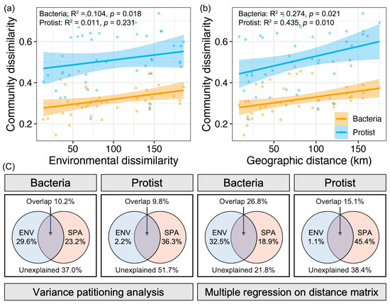 Relationships between community similarity (Bray–Curtis) and (a) environmental similarity (Euclidean distance) and (b) geographic distance for bacterial and protistan communities. The line in each sub-figure represents the fitted curve, and the gray shadow represents the 95% confidence interval. (c) VPA and MRM results for bacterial and protistan communities based on environmental and spatial variables.