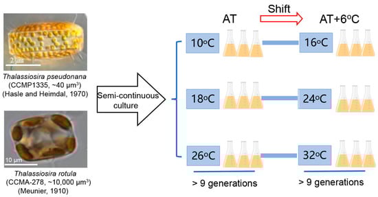 Our previous results showed that the responses of the natural phytoplankton community to temperature rise are very different in different seasons, as evidenced by the larger cells benefiting more from the temperature rise in winter and the smaller cells tolerating it more in summer [35]. To uncover the mechanism underlying this phenomenon, we acclimated two representative diatom species, the smaller Thalassiosira pseudonana (Hasle and Heimdal, 1970) and the larger Thalassiosira rotula (Meunier, 1910), at three ambient temperatures (ATs, i.e., 10 °C, 18 °C and 26 °C), shifted them to a rising temperature (AT + 6 °C) and examined their changes in physiological performance and transcriptome. This work contributes to gaining a better understanding of the different responses and adaptation strategies employed by marine phytoplankton with different cell sizes in response to a temperature rise at different ambient temperatures.