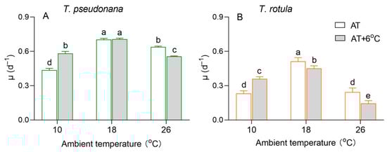The specific growth rate (μ, d−1) of the smaller diatom Thalassiosira pseudonana (A) and the larger Thalassiosira rotula (B) at three ambient temperatures and the increased temperature. Values are the mean ± SD for triplicate independent cultures, and different letters above the bars indicate significant differences (p < 0.05, one-way ANOVA).