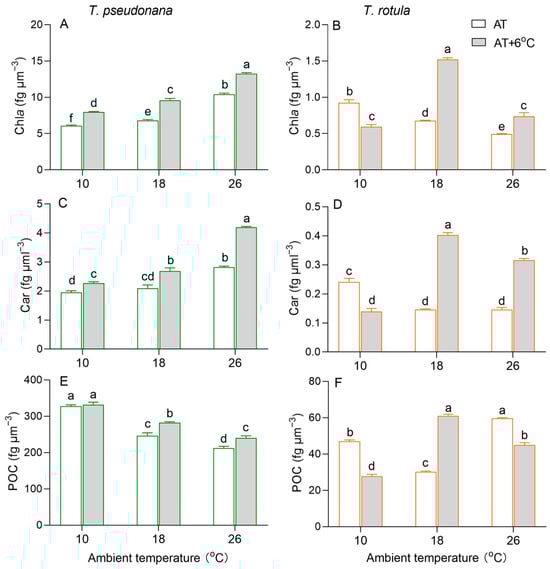 Cellular content (fg μm−3) of chlorophyll a ((A,B); Chl a), carotenoids ((C,D); Cars) and particulate organic carbon ((E,F); POC) of the smaller diatom T. pseudonana and the larger T. rotula at three ambient temperatures and the increased temperature. Values are the mean ± SD for triplicate independent cultures, and different letters above the bars indicate significant differences (p < 0.05, one-way ANOVA).