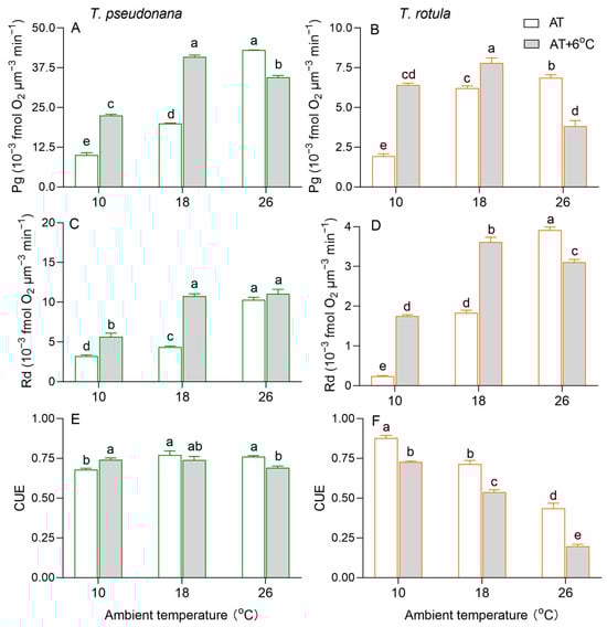 The rate (×10−3 fmol O2 μm−3 min−1) of gross photosynthesis ((A,B); Pg) and dark respiration ((C,D); Rd) and the carbon use efficiency ((E,F); CUE) of the smaller diatom T. pseudonana and the larger T. rotula at three ambient temperatures and the increased temperature. Values are the mean ± SD for triplicate cultures, and different letters above the bars indicate significant differences (p < 0.05, one-way ANOVA).