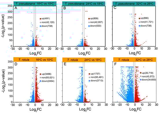 A volcano plot of differentially expressed genes (DEGs) in the smaller diatom T. pseudonana (A–C) and the larger T. rotula (D–F) responding to the increased temperature at three ambient temperatures.