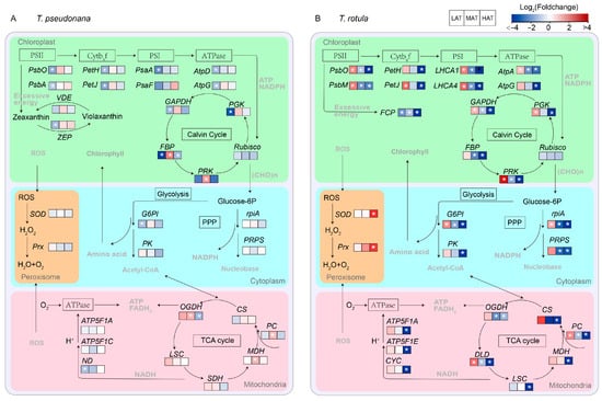 Transcriptomic schematic diagram of changes in carbon metabolic pathways of smaller T. pseudonana (A) and larger T. rotula (B) responding to increased temperature T three ambient temperatures. Significant differentially expressed genes (DEGs) (|log2FC| > 1, p < 0.05) are highlighted with white star. Details of DEPs are shown in Table S2.