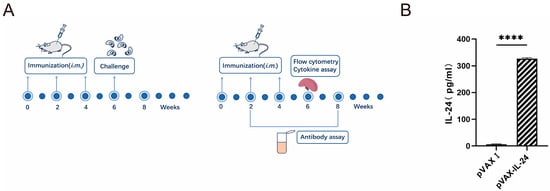 Determination of the expression of pVAX-IL-24 in vitro in 293-T cells by ELISA and immunization. (A) Flow chart of mice immunization and immunological analyses. (B) 293-T cells were transfected with empty pVAX I or pVAX-IL-24. Statistical significance is indicated as **** p < 0.0001.