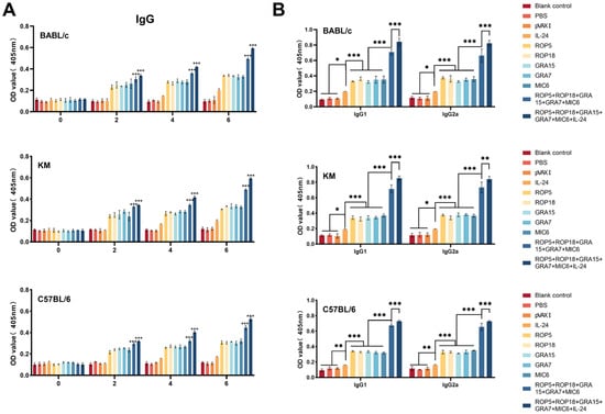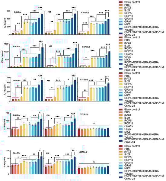 As shown in Figure 2B, levels of IgG1 and IgG2a, as well as the IgG2a/IgG1 ratio, were markedly higher in the immunized groups compared to the control groups. Similar to the IgG levels, the IgG2a/IgG1 ratios were significantly higher in the group receiving the combination of pVAX-ROP5, pVAX-ROP18, pVAX-GRA7, pVAX-GRA15, and pVAX-MIC6 compared to those immunized with single plasmids. Co-administration of pVAX-IL-24 with the multi-gene vaccine resulted in the highest IgG2a/IgG1 ratio; however, no significant differences in the IgG2a/IgG1 ratio were observed among the control groups (p > 0.05). In terms of mouse strains, IgG and subclass (IgG1 and IgG2a) levels were comparable between vaccinated BALB/c and Kunming mice, while both vaccinated and control C57BL/6 mice exhibited lower IgG and subclass levels (Figure 2A,B).