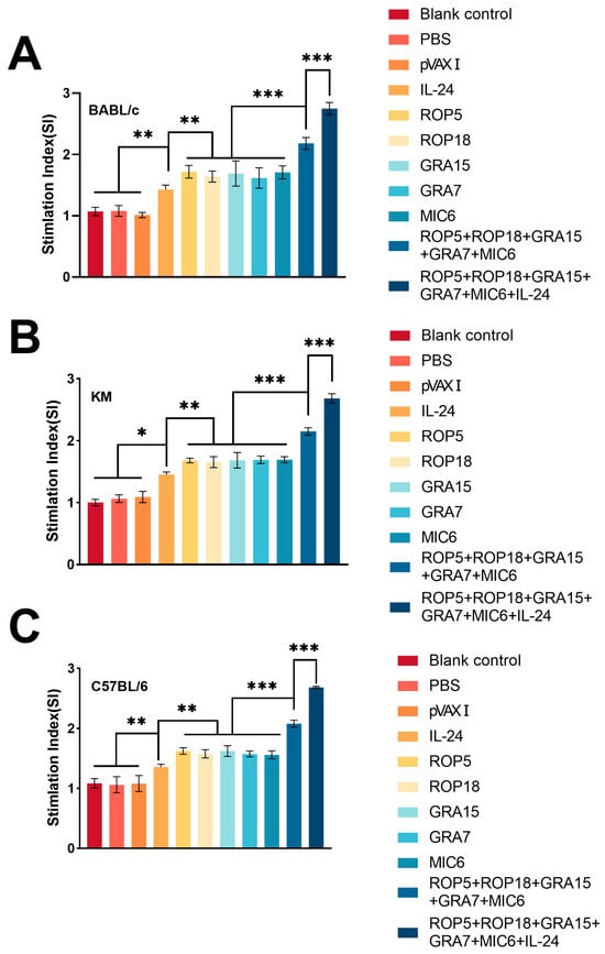 The lymphocyte proliferative response was evaluated following stimulation with TLA or ConA using the MTT assay. As shown in Figure 3, the stimulation index (SI) in spleen cells from all vaccinated groups was higher than that of non-immunized controls. The administration of pVAX-IL-24 significantly enhanced the SI for the multi-gene DNA vaccine plasmids; however, no significant differences in SI were found among the groups receiving single-plasmid immunization (p > 0.05). Similar proliferative responses were observed in spleen cells from vaccinated BALB/c (Figure 3A), Kunming mice (Figure 3B), and C57BL/6 (Figure 3C) following stimulation with TLA or ConA.