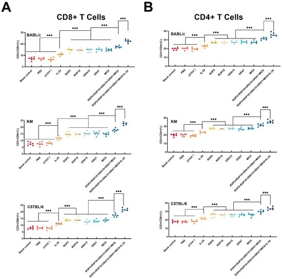 Percentages of CD4+ and CD8+ T cells in immunized and control mice across different mouse strains. (A) The proportion of CD4+ T cells is shown for both immunized and control groups in BALB/c, C57BL/6, and Kunming mice, n = 3/group in each mouse strain. (B) The proportion of CD8+ T cells is shown for both immunized and control groups in BALB/c, C57BL/6, and Kunming mice, n = 3/group in each mouse strain. Statistical significance is indicated as *** p < 0.001. Data are presented as means ± SD.