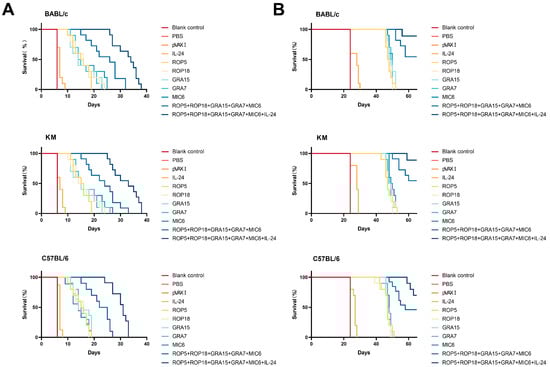 Survival curves of immunized BALB/c, C57BL/6, and Kunming mice two weeks after the final immunization. (A) Survival rates of immunized mice (BALB/c, C57BL/6, and Kunming mice) challenged with 1 × 103 tachyzoites of the RH strain, n = 8/group in each mouse strain. (B) Survival rates of immunized mice (BALB/c, C57BL/6, and Kunming mice) challenged with 100 cysts of the ME49 strain, n = 8/group in each mouse strain 100 cysts of the ME49 strain.