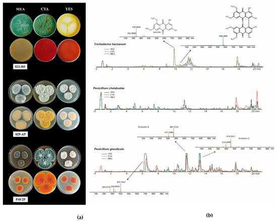 (a) Recto and verso of T. harzianum, P. chalabudae, and P. glandicola strains on MEA, CYA, and YES culture media (from top to bottom). (b) HPLC-HRMS chromatogram of metabolites detected by analysis.