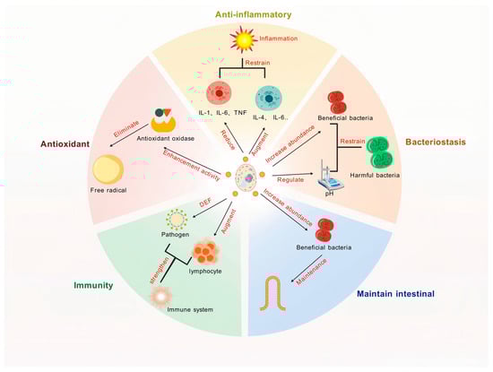 Yeast and its derivatives are not only pivotal in enhancing the antioxidant capacity of animals but also exhibit robust antimicrobial properties, making them essential tools in reducing pathogen infections and transmission during livestock and poultry production. These antimicrobial effects are mediated through diverse mechanisms, including modulation of gut microbiota, enhancement of intestinal barrier function, and immune system regulation, which collectively contribute to improved animal health and productivity (Figure 3).